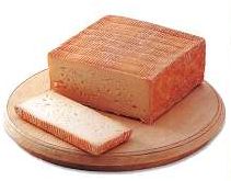A l'oeil : croûte dorée, épaisse, fleurie de tâches rouges et orangées ; pâte jaune bien liée.